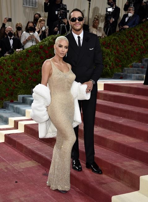 Kardashian was the final celebrity to walk the Met Gala red carpet, joined by her boyfriend, Pete Davidson. She swapped her signature long black hair for a tight platinum blonde bun, emulating Monroe.