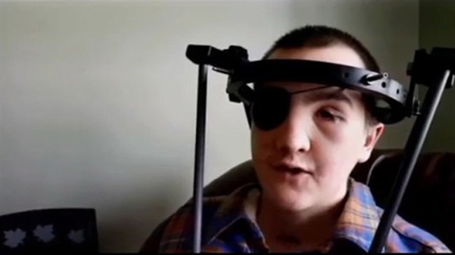 In a video posted to social media, Caleb thanks members of his family’s church for their prayers and support. A metal halo circles the top of his head and a patch covers his right eye.