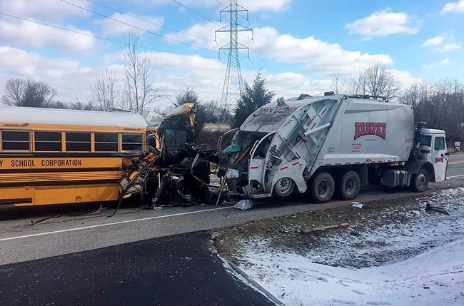State Police Sgt. Stephen Wheeles says 22 students were on the South Dearborn Community School Corporation bus when it struck a garage truck that had stopped along State Road 350 near Aurora, about 30 miles (48 kilometres) west of Cincinnati.