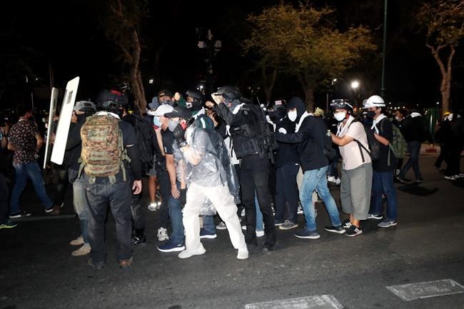 BANGKOK – Pro-democracy protesters in Thailand clashed with police Saturday night while seeking the release of four comrades awaiting trial on charges of defaming the monarchy.