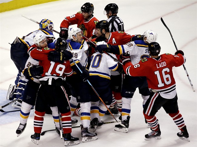The crowd responded with chants of “Co-rey! Co-rey!” and the resulting fracas between the teams somehow generated a power play for the Blackhawks. Fabbri (interference), Alex Pietrangelo (roughing) and Kevin Shattenkirk (roughing) were sent off for St. Louis, and Crawford (roughing) and Ladd (roughing) were penalized for Chicago.