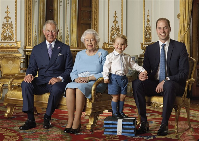 The toddler prince is pictured alongside his father Prince William, grandfather Prince Charles and great-grandmother Queen Elizabeth II in stamps issued to mark the queen’s 90th birthday on Thursday.