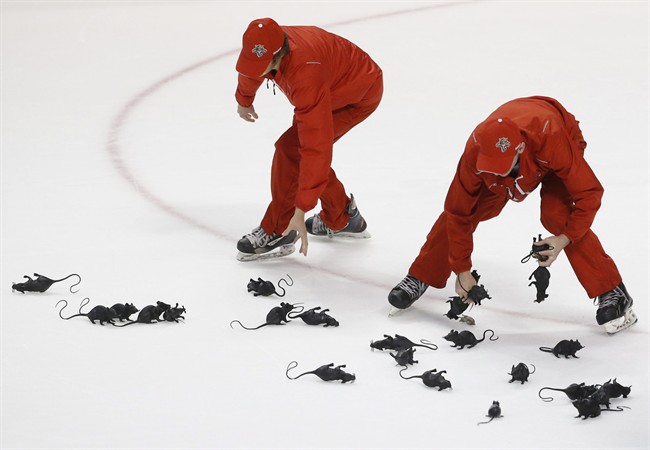 That won’t be a problem until at least next spring, as the Red Wings were eliminated Thursday night. The NHL told the Panthers that fans can throw toy rats on the ice only after a game.