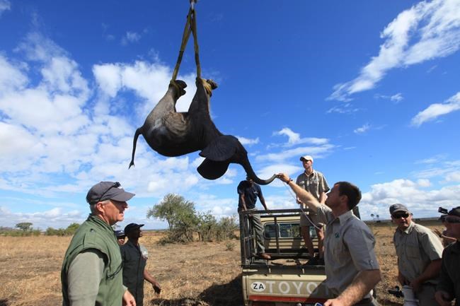 Conservationists flipped the prostrate elephants’ large ears over their eyes to block out light, and propped open the tips of their trunks with twigs to ensure unimpeded breathing. Then the multi-ton elephants, hanging upside down from ankle straps, were loaded by crane onto trucks for a road trip of about 185 miles (300 kilometres) to a safer, more spacious area.