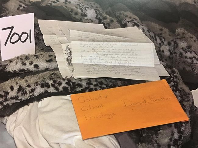 Photographs of the letters — taken by police in Noudga’s house — show numerous open yellow envelopes with “Deepak Paradkar Solicitor Client Privilege” written on them.