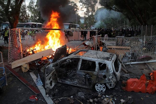 Gasoline bombs and fires lit up the night at the Chinese University of Hong Kong, while police massed for a possible clearing action with a water cannon truck.