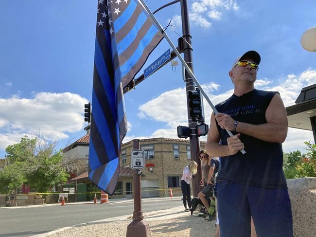 John Garrod of Arvada held a black and white flag with blue stripes at the beginning of a line of about 30 police cars before the procession, a flag he hangs outside his house whenever an officer is killed. His son, brother-in-law and nephew are all in law enforcement, he said.