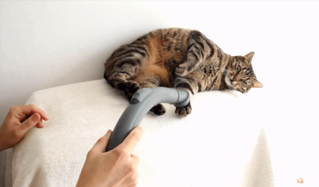 This cat loves being vacuumed.