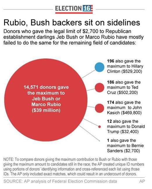 Yet, donors who once gave as much as allowed by law to establishment favourites Jeb Bush and Marco Rubio have mostly disappeared from the political landscape, an Associated Press analysis of campaign finance records shows.
