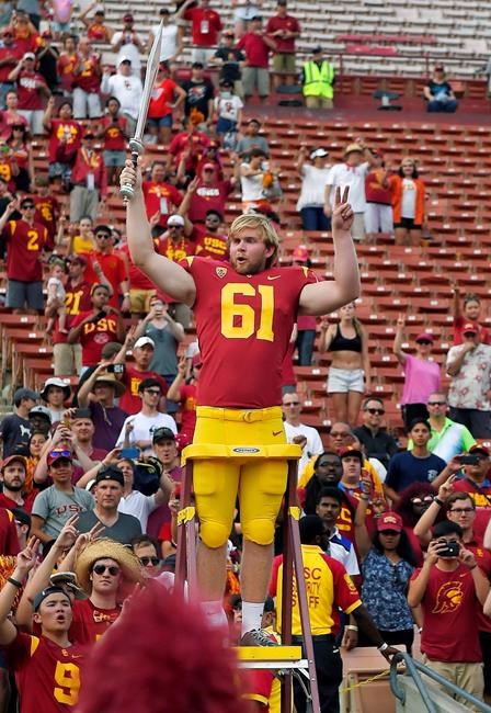 Carroll allowed Olson to lead the USC band after a game when he first became a part of the program eight years ago. Olson did it again Saturday, climbing the ladder and holding aloft the sword traditionally used to lead the band — but he did it in his game uniform.