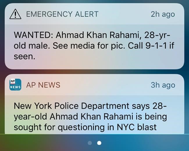 NEW YORK – Many people in the New York City area were alerted Monday morning to a screeching, buzzing message about a man wanted in connection with explosions in the area over the weekend.