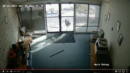 The person that posted the security footage of the culprit in action says employees arrived at work on Monday to find the front doors of the office smashed, but nothing was missing.