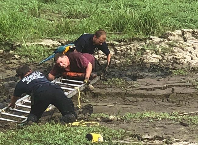 The man was in mud up to his waist when crews arrived. Video shows that firefighters had to extend ladders across the mud to help him out — as the parrot remained perched on his shoulders.