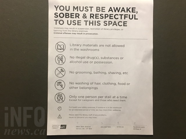 VERNON – The Vernon Library has posted signs stating people must be “awake, sober and respectful” in response to an increase in inappropriate behaviours.