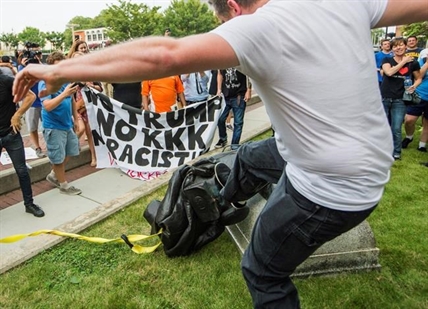 Law enforcement officers took video throughout the protest but didn't intervene as protesters brought out a ladder, climbed up to attach a rope and then pulled the bronze Confederate soldier from its pedestal. After it fell, some began kicking the statue, while others took photos standing or sitting on it. The protest was in response to violence and a death at a white nationalist rally in Charlottesville, Virginia, over the weekend.