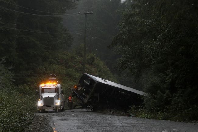 The bus hit the soft shoulder on the gravel logging road and rolled onto its roof, resting about three metres below the road, he said. Thick trees along the road prevented the bus from going any further down the steep embankment, Nightingale said.