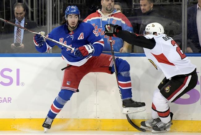 NOTES: Rangers forward Mats Zuccarello was sidelined for the second straight game with a groin injury. The Norwegian winger has missed eight of the previous 10 games. . As part of the NHL’s Hockey Fights Cancer initiative, the Rangers wore purple warmup jerseys, and used purple tape during pre-game warmups. . Rangers defenceman Tony DeAngelo returned to the lineup after being a healthy scratch Saturday against the Capitals. . New York scratched Frederik Claesson. . Ottawa defenceman Mark Borowiecki missed his second straight game with an upper body injury and the Senators scratched forward Max McCormick.