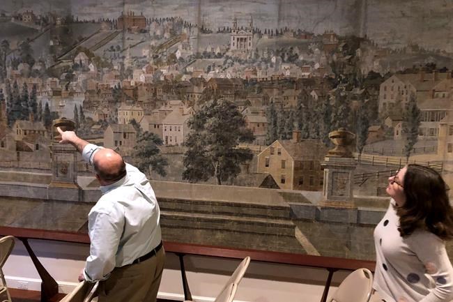 The panorama of the city is displayed in the organization’s ballroom in Providence, serving as a backdrop for many public programs. Conservators recently removed decades of dust, painted worn sections along the seams and repaired small tears. The historical society and a private donor paid for the work.