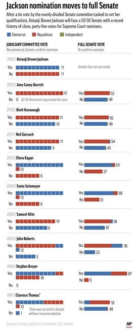The Senate’s 53-47 vote Monday evening was to “discharge” Jackson’s nomination from the Senate Judiciary Committee after the panel deadlocked, 11-11, on whether to send the nomination to the Senate floor.