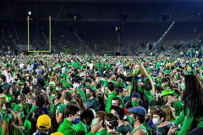 The mass of students, players and coaches crammed close together on the field in the minutes following the Fighting Irish’s 47-40 win Saturday night in South Bend, Indiana, over then-No. 1 Clemson. Many were not wearing masks or had them pulled down.