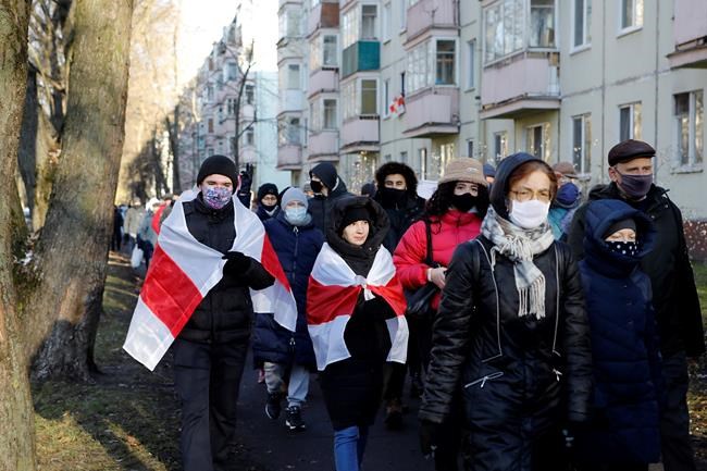 “We believe! We can! We will win!” the demonstrators chanted. Several people wore Santa Claus costumes and masks depicting President Alexander Lukashenko. “Give Belarusians a gift: go away,” a banner they carried read.