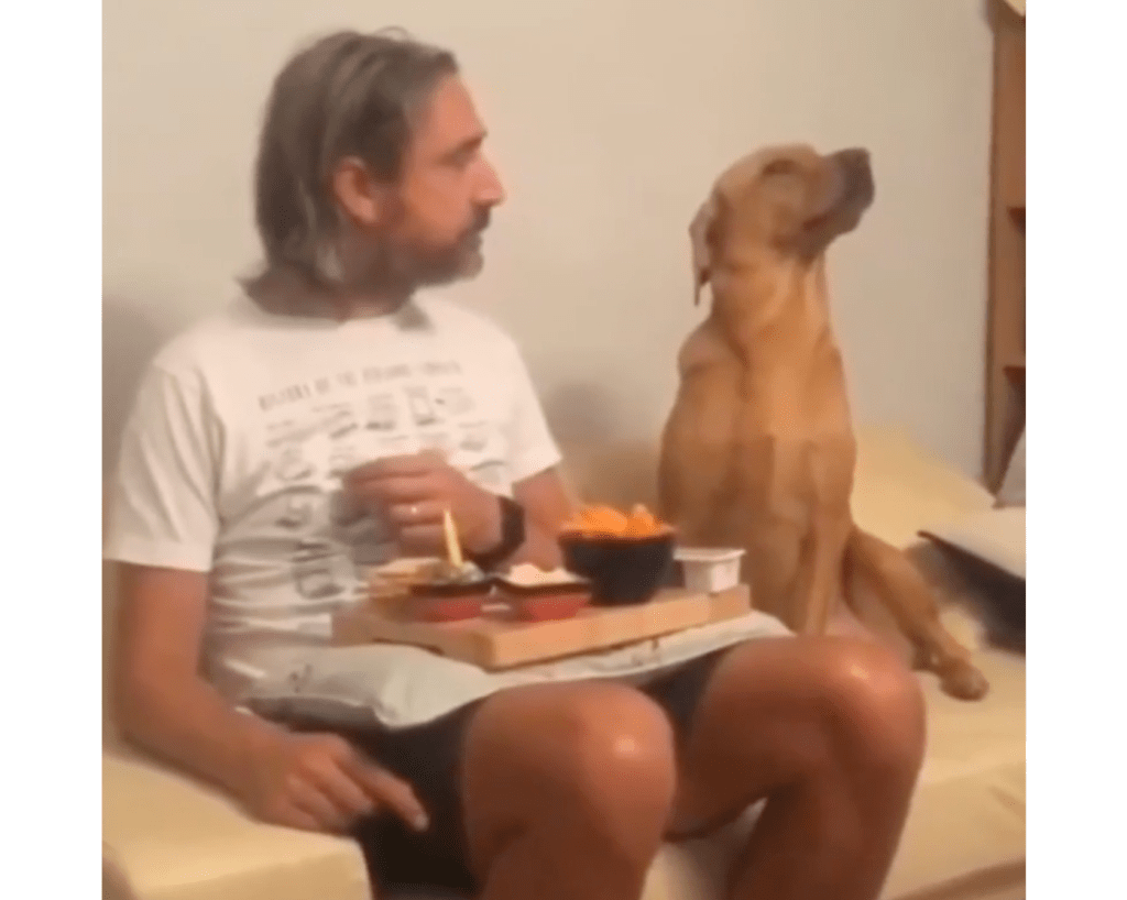 This poor pup desperately wants a snack from his human's dinner.