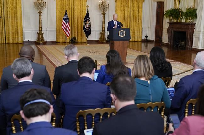 NEW YORK (AP) — For the first half of one of his rare news conferences as president, Joe Biden stuck to an organized plan, calling on reporters from a list in a binder.