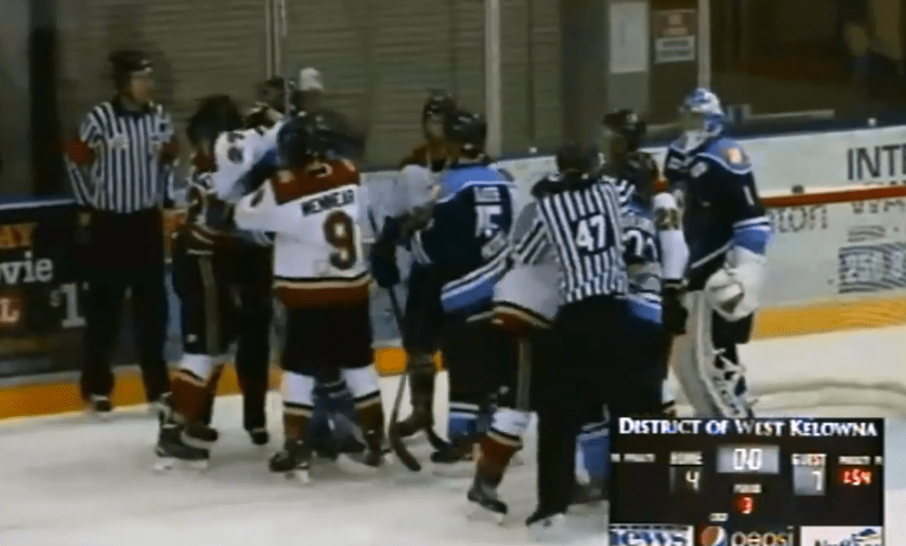 When the dust settled, the teams were assessed 102 minutes in penalties including six fighting majors, seven game misconducts and a minor penalty to Vernon netminder Danny Todosychuk who left his crease and to scrap with Warriors Kade Kehoe.