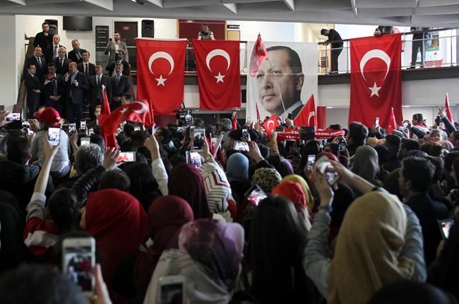 In a campaign rally Sunday before a referendum on expanding the powers’ of his office, Erdogan also called on international organizations to impose sanctions on the Netherlands.