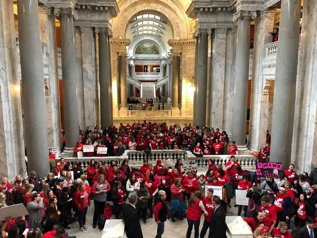 In Kentucky, teachers don’t strike but they co-ordinate to all use their sick days on the same day, forcing districts to close because they don’t have enough substitutes to cover classes. Hundreds of teachers wearing red shirts clogged the stairs leading to the House chamber, chanting so loudly they disrupted hearings before the state Supreme Court.