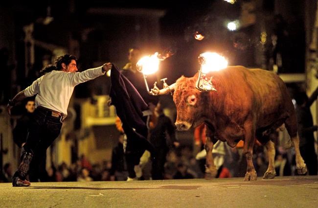BARCELONA, Spain – The southern Mediterranean city of Valencia has banned a longtime tradition in which bulls are set loose on neighbourhood streets with flaming balls of wax or fireworks affixed to their horns.