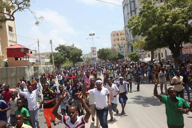 The protesters chanted slogans against the extremist group al-Shabab, which Somalia’s government blames for the attack.