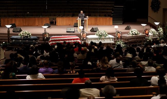 At Saturday’s funeral, five caskets were lined up at the front of the church, flowers atop four of them and a U.S. flag on the other.