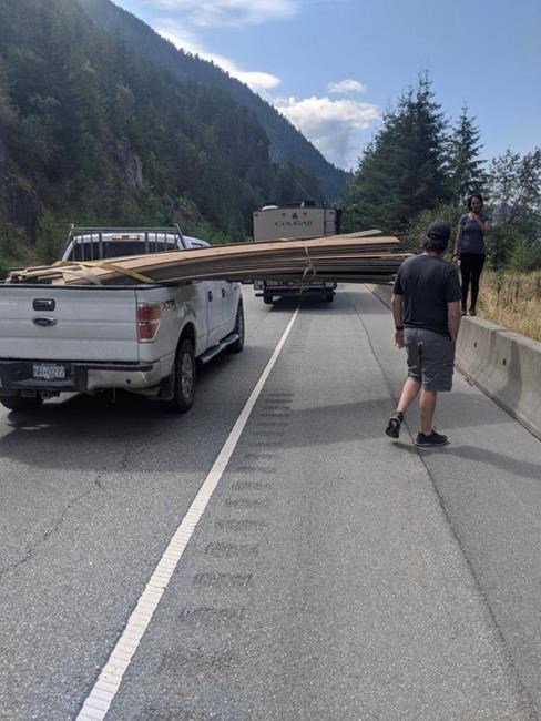 A statement from Squamish Traffic Services confirms the cyclist was hit when a pick-up truck with an insecure load passed him Monday on the Sea-to-Sky Highway near Lions Bay, B.C.