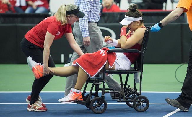 Bianca Andreescu of Mississauga, Ont., playing in place of the injured Francoise Abanda, was unable to finish the opening singles match when she dropped to the court with painful leg cramps and had to retire while trailing 4-6, 6-4, 4-0 to Lesia Tsurenko.