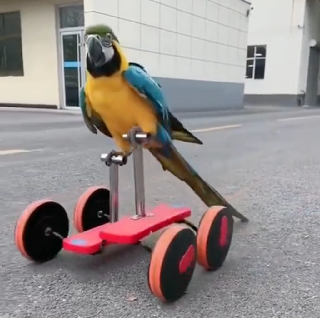The parrot took a ride on his tiny bicycle.