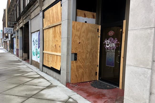 Sherry Ludwig’s shop, Bisou Lingerie, is among the many downtown businesses that are protected by plywood. She said looters in August smashed her front window, stole her cash register and did about $35,000 worth of damage that took six weeks to repair.