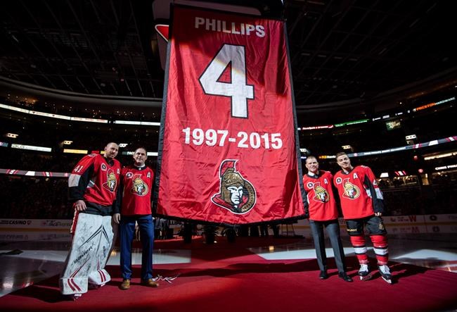 OTTAWA – Retired defenceman Chris Phillips was honoured by the Senators on Tuesday night by having his No. 4 raised to the arena rafters ahead of Ottawa’s game against the Buffalo Sabres.