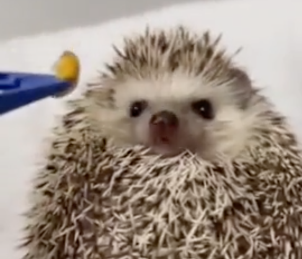This adorable little hedgehog starts off hungry and grumpy, but has an instant mood change when offered a delicious snack.