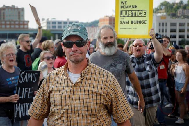 No problems were reported as fewer than two dozen supporters of former University of Cincinnati officer Ray Tensing quietly walked across an Ohio River bridge Monday evening. About 40 counter-protesters urging justice for slain motorist Sam DuBose marched behind them.