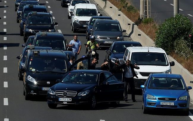 BARCELONA, Spain – Taxi drivers in Barcelona are blocking traffic on a major thoroughfare as part of an indefinite strike to protest the use of ride-hailing apps like Uber and Cabify.