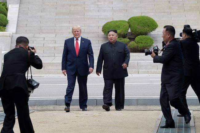 At the start of Sunday’s meeting, Trump went across ankle-high concrete slabs that form the military demarcation line at Panmunjom after Kim told him he would become the first U.S. president to be in North Korea if he did so. After walking together toward north several meters (several feet), they turned back to the South for a summit that lasted about 50 minutes.