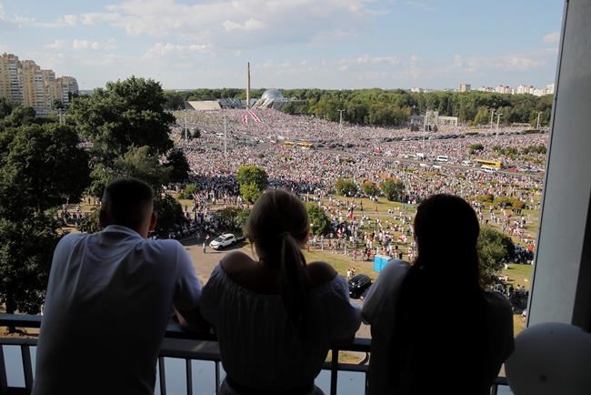About 50,000 people listened to Lukashenko in a square near the main government building in the capital of Minsk. But as he spoke, throngs of supporters streamed to their own rally about 2.5 kilometres (1.5 miles) away. It was the eighth straight day of anti-government demonstrations.