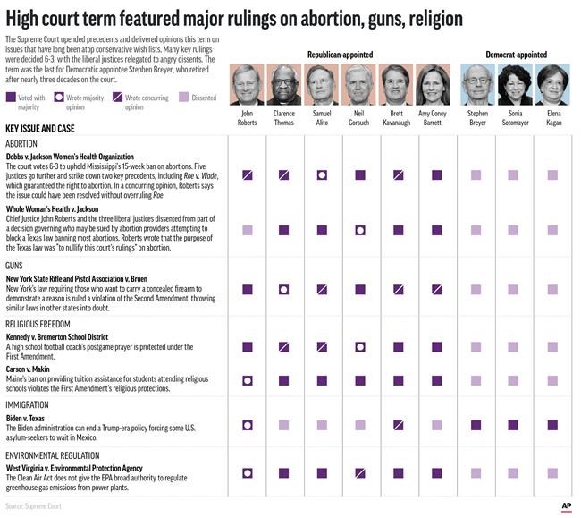 WASHINGTON (AP) — Abortion, guns and religion — a major change in the law in any one of these areas would have made for a fateful Supreme Court term. In its first full term together, the court’s conservative majority ruled in all three and issued other significant decisions limiting the government’s regulatory powers.
