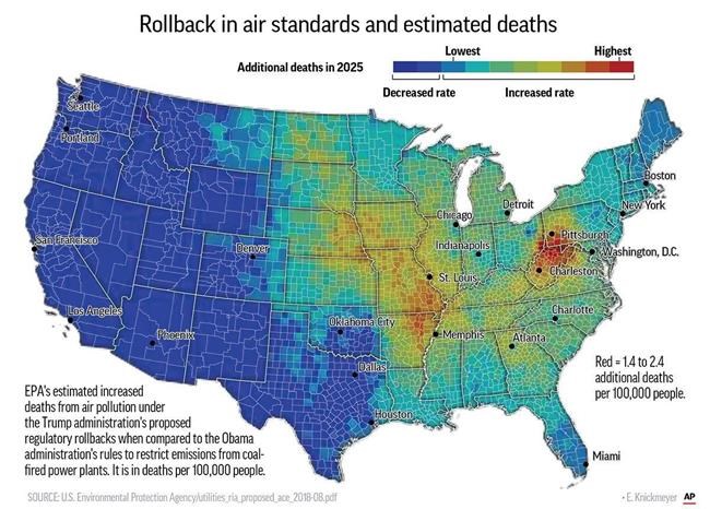 Nationally, the EPA says, 350 to 1,500 more people would die each year under Trump’s plan. But it’s the northern two-thirds of West Virginia and the neighbouring part of Pennsylvania that would be hit hardest, by far, according to Trump’s EPA.