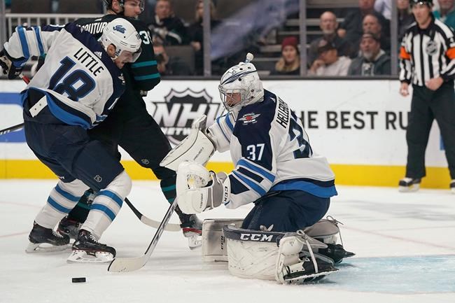 Connor Hellebuyck made 51 saves to hold off a furious San Jose attack and Nikolaj Ehlers scored the tiebreaking goal with 1:24 left to send the Jets to a 3-2 victory over the Sharks on Friday night.