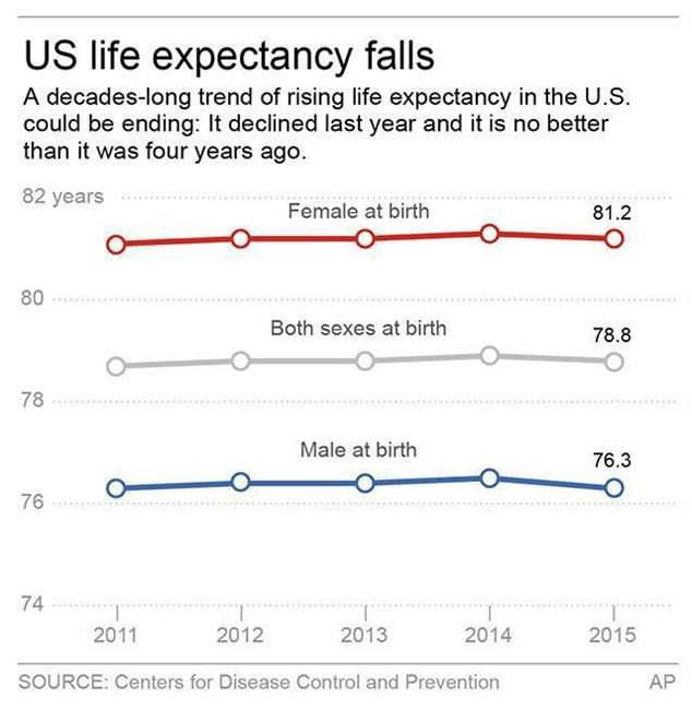 Average life expectancy declined for men, falling by more than two months, to 76 years and 3 1/2 months in 2015. It fell by about one month for women, to 81 years and 2 1/2 months, the CDC said.