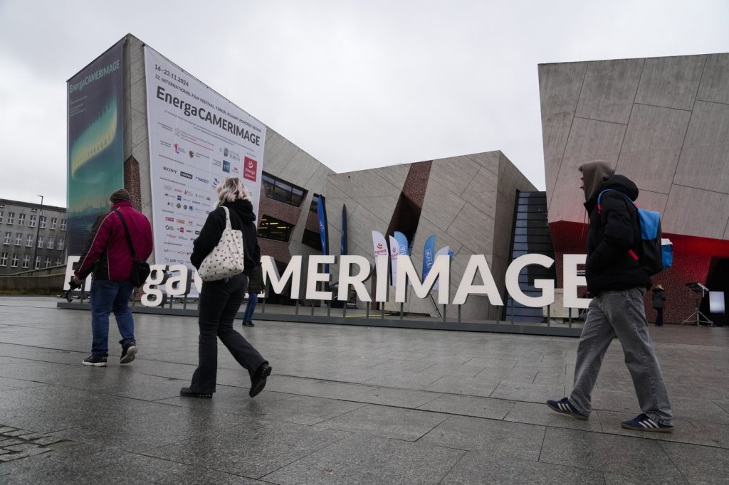 A person walks in front of the venue of the 32nd Camerimage International Film Festival in Torun, Poland, Wednesday, Nov. 20, 2024. (AP Photo/Czarek Sokolowski)