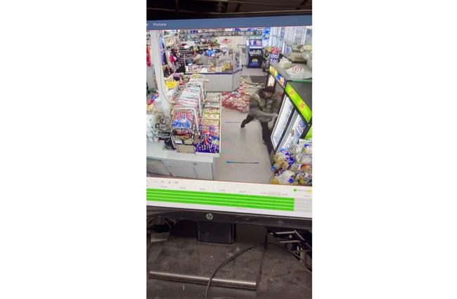 Surveillance footage shows a man pulling a merchandise rack to the floor and swinging a street sign post into the glass of the refrigerators. A man who appears to a friend of the attacker cheers him on.