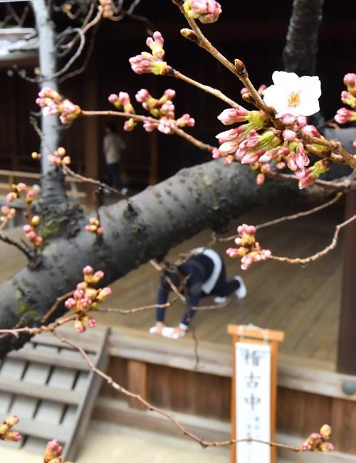 A Japan Meteorological Agency official counted at least five flowers blooming on a monitoring tree Tuesday at Yasukuni Shrine. He made the much-awaited announcement to media and visitors taking photos of a few pale pink flowers on the still mostly bare trees.